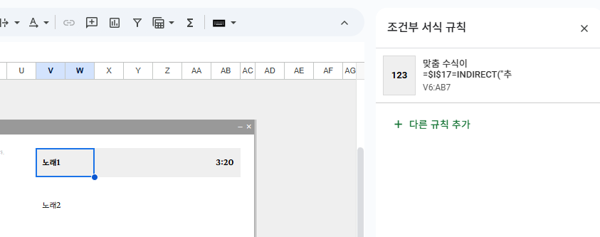 +) 프리셋/선택한 곡 표시(배경회색처리&볼드체)의 경우 조건부서식을 이용합니다. 색상 변경을 원할 경우 조건부 서식에서 만져주세요.