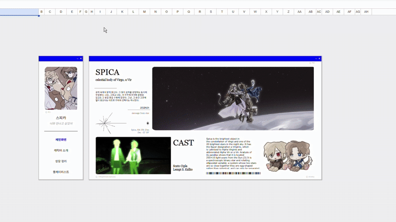 +) 모서리를 둥근 형태로 처리해 주는, 셀 위 있는 도형을 지우거나 페이지 이름 변경 시 시트 작동에 문제가 생깁니다. 전자의 경우 메인화면이나 캐릭터소개 화면으로 넘어가는 건 기능하나 추가적인 기능이 막히며, 후자의 경우 클릭을 통해 메인화면이나 캐릭터 소개 화면으로 넘어가는 행위 자체가 불가능해집니다. (: 후자의 경우 코드 수정으로 작동이 가능하게 할 수 있습니다. 관련해 다룰 수 있는 분은 임의로 수정해도 괜찮습니다.)
