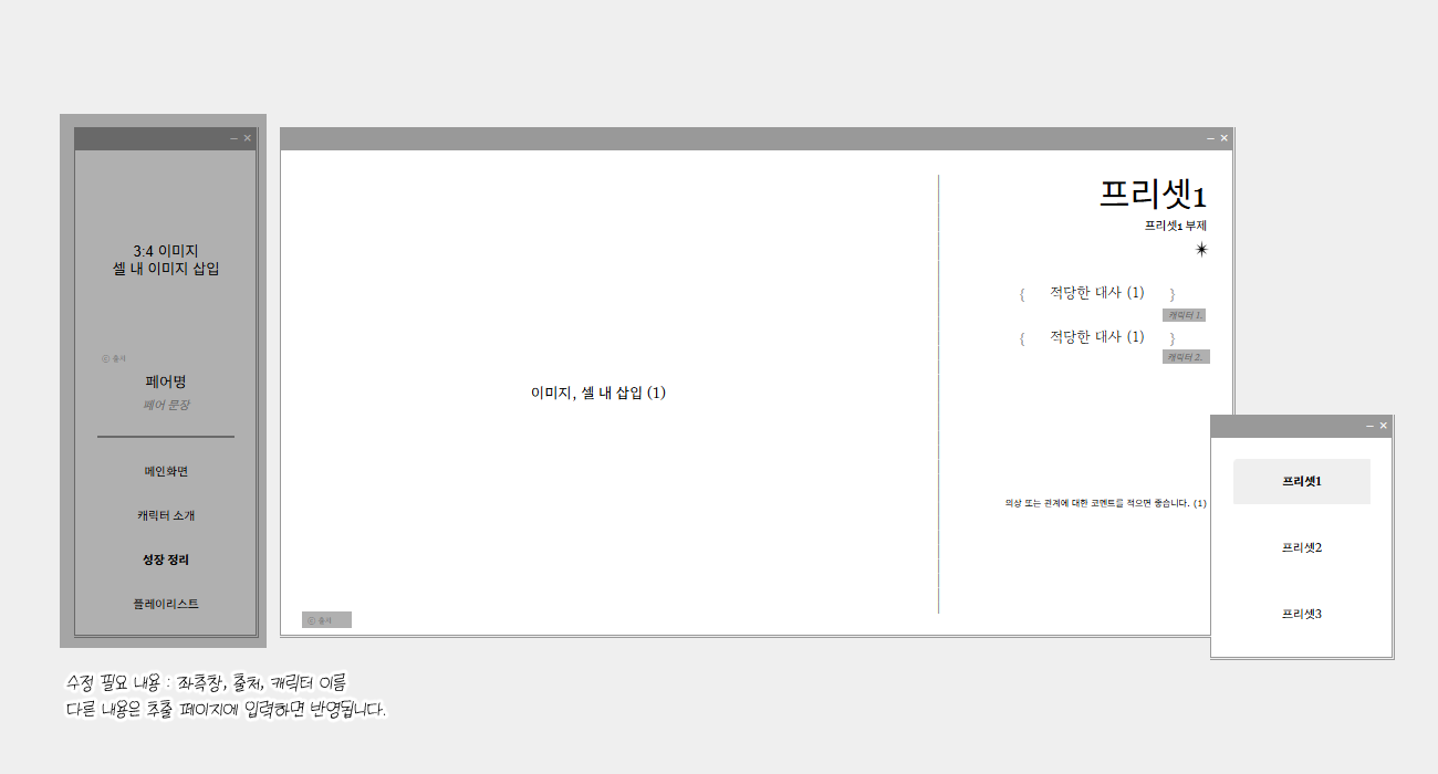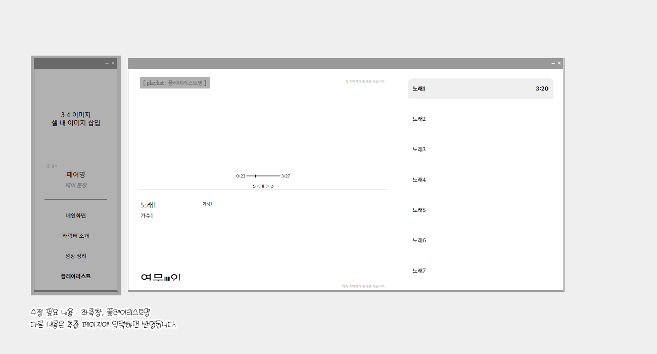 간접적인 수정이 필요한 페이지는 추출 페이지에 입력해서 화면 표시값을 설정하시면 됩니다. 성장정리 페이지는 일부 색 변경과 중괄호({}) 아래 작게 들어가는 캐릭터 이름 외엔 수정을 요구하지 않으며, 플레이리스트 페이지 역시 일부 색 변경과 좌측 상단 플레이리스트명 외엔 수정을 요구하지 않습니다.